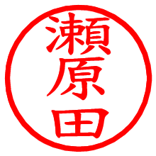 [朱肉の色]を選び、入力窓に“瀬原田”と入力して[生成]ボタンを押すと、印影が更新され、リンクから電子印鑑(デジタル印影)がダウンロードできます。 電子印鑑「瀬原田」の作り方文字表示が変なときや、文字バランスが悪いときは[字形切替]のチェックボックスでON/OFFを切り替え[生成]しなおしてください。 生成される画像は通常の印影「瀬原田.png」と、にじみを表現した少し太めの印影「瀬原田B.png」の背面透過PNG形式2種と、鮮明なPDF形式の印影「瀬原田.pdf」の計3種類です。 朱肉の微妙な色の違いを7色で表現しました。デフォルト(左端)は、JISが定めた朱肉の色のマンセル値(7.5R 5/14)をRGB値(217,66,54)に変換したものになっています。 「電子透かし」にチェックを入れて[生成]ボタンを押すと、タイムスタンプを電子透かしとして埋め込んだセキュアな電子印鑑が作れます。詳細は別ページの「タイムスタンプと電子透かし」でご覧ください。 瀬原田さんの日付印が作れます。「日付スタンプメーカー」は、社内向けの書類に利用されることの多い日付印(データ印)が無料で作れるWebアプリケーションです。中段に日付が入り、上段と下段は、ともに8文字まで文字が入ります。 ![]() 古代文字で落款印が作れます。「落款スタンプメーカー」で作品を引き立たせる落款印が作れます。