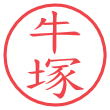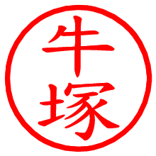[朱肉の色]を選び、入力窓に“牛塚”と入力して[生成]ボタンを押すと、印影が更新され、リンクから電子印鑑(デジタル印影)がダウンロードできます。 電子印鑑「牛塚」の作り方文字表示が変なときや、文字バランスが悪いときは[字形切替]のチェックボックスでON/OFFを切り替え[生成]しなおしてください。 生成される画像は通常の印影「牛塚.png」と、にじみを表現した少し太めの印影「牛塚B.png」の背面透過PNG形式2種と、鮮明なPDF形式の印影「牛塚.pdf」の計3種類です。 朱肉の微妙な色の違いを7色で表現しました。デフォルト(左端)は、JISが定めた朱肉の色のマンセル値(7.5R 5/14)をRGB値(217,66,54)に変換したものになっています。 「電子透かし」にチェックを入れて[生成]ボタンを押すと、タイムスタンプを透かしとして埋め込んだセキュアな電子印鑑が作れます。詳細は別ページの「電子透かしとタイムスタンプ」でご覧ください。  牛塚さんの日付印が作れます。「日付スタンプメーカー」は、社内向けの書類に利用されることの多い日付印(データ印)が無料で作れるWebアプリケーションです。中段に日付が入り、上段と下段は、ともに8文字まで文字が入ります。 ![]()  古代文字で落款印が作れます。「落款スタンプメーカー」で作品を引き立たせる落款印が作れます。