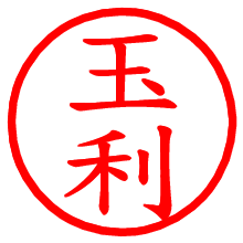 [朱肉の色]を選び、入力窓に“玉利”と入力して[生成]ボタンを押すと、印影が更新され、リンクから電子印鑑(デジタル印影)がダウンロードできます。 電子印鑑「玉利」の作り方文字表示が変なときや、文字バランスが悪いときは[字形切替]のチェックボックスでON/OFFを切り替え[生成]しなおしてください。 生成される画像は通常の印影「玉利.png」と、にじみを表現した少し太めの印影「玉利B.png」の背面透過PNG形式2種と、鮮明なPDF形式の印影「玉利.pdf」の計3種類です。 朱肉の微妙な色の違いを7色で表現しました。デフォルト(左端)は、JISが定めた朱肉の色のマンセル値(7.5R 5/14)をRGB値(217,66,54)に変換したものになっています。 「電子透かし」にチェックを入れて[生成]ボタンを押すと、タイムスタンプを透かしとして埋め込んだセキュアな電子印鑑が作れます。詳細は別ページの「電子透かしとタイムスタンプ」でご覧ください。 玉利さんの日付印が作れます。「日付スタンプメーカー」は、社内向けの書類に利用されることの多い日付印(データ印)が無料で作れるWebアプリケーションです。中段に日付が入り、上段と下段は、ともに8文字まで文字が入ります。 ![]() 古代文字で落款印が作れます。「落款スタンプメーカー」で作品を引き立たせる落款印が作れます。