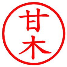 [朱肉の色]を選び、入力窓に“甘木”と入力して[生成]ボタンを押すと、印影が更新され、リンクから電子印鑑(デジタル印影)がダウンロードできます。 電子印鑑「甘木」の作り方文字表示が変なときや、文字バランスが悪いときは[字形切替]のチェックボックスでON/OFFを切り替え[生成]しなおしてください。 生成される画像は通常の印影「甘木.png」と、にじみを表現した少し太めの印影「甘木B.png」の背面透過PNG形式2種と、鮮明なPDF形式の印影「甘木.pdf」の計3種類です。 朱肉の微妙な色の違いを7色で表現しました。デフォルト(左端)は、JISが定めた朱肉の色のマンセル値(7.5R 5/14)をRGB値(217,66,54)に変換したものになっています。 「電子透かし」にチェックを入れて[生成]ボタンを押すと、タイムスタンプを電子透かしとして埋め込んだセキュアな電子印鑑が作れます。詳細は別ページの「タイムスタンプと電子透かし」でご覧ください。 甘木さんの日付印が作れます。「日付スタンプメーカー」は、社内向けの書類に利用されることの多い日付印(データ印)が無料で作れるWebアプリケーションです。中段に日付が入り、上段と下段は、ともに8文字まで文字が入ります。 ![]() 古代文字で落款印が作れます。「落款スタンプメーカー」で作品を引き立たせる落款印が作れます。
