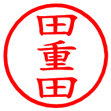 [朱肉の色]を選び、入力窓に“田重田”と入力して[生成]ボタンを押すと、印影が更新され、リンクから電子印鑑(デジタル印影)がダウンロードできます。 電子印鑑「田重田」の作り方文字表示が変なときや、文字バランスが悪いときは[字形切替]のチェックボックスでON/OFFを切り替え[生成]しなおしてください。 生成される画像は通常の印影「田重田.png」と、にじみを表現した少し太めの印影「田重田B.png」の背面透過PNG形式2種と、鮮明なPDF形式の印影「田重田.pdf」の計3種類です。 朱肉の微妙な色の違いを7色で表現しました。デフォルト(左端)は、JISが定めた朱肉の色のマンセル値(7.5R 5/14)をRGB値(217,66,54)に変換したものになっています。 「電子透かし」にチェックを入れて[生成]ボタンを押すと、タイムスタンプを透かしとして埋め込んだセキュアな電子印鑑が作れます。詳細は別ページの「電子透かしとタイムスタンプ」でご覧ください。 田重田さんの日付印が作れます。「日付スタンプメーカー」は、社内向けの書類に利用されることの多い日付印(データ印)が無料で作れるWebアプリケーションです。中段に日付が入り、上段と下段は、ともに8文字まで文字が入ります。 ![]() 古代文字で落款印が作れます。「落款スタンプメーカー」で作品を引き立たせる落款印が作れます。
