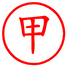 [朱肉の色]を選び、入力窓に“甲”と入力して[生成]ボタンを押すと、印影が更新され、リンクから電子印鑑(デジタル印影)がダウンロードできます。 電子印鑑「甲」の作り方文字表示が変なときや、文字バランスが悪いときは[字形切替]のチェックボックスでON/OFFを切り替え[生成]しなおしてください。 生成される画像は通常の印影「甲.png」と、にじみを表現した少し太めの印影「甲B.png」の背面透過PNG形式2種と、鮮明なPDF形式の印影「甲.pdf」の計3種類です。 朱肉の微妙な色の違いを7色で表現しました。デフォルト(左端)は、JISが定めた朱肉の色のマンセル値(7.5R 5/14)をRGB値(217,66,54)に変換したものになっています。 「電子透かし」にチェックを入れて[生成]ボタンを押すと、タイムスタンプを電子透かしとして埋め込んだセキュアな電子印鑑が作れます。詳細は別ページの「タイムスタンプと電子透かし」でご覧ください。 甲さんの日付印が作れます。「日付スタンプメーカー」は、社内向けの書類に利用されることの多い日付印(データ印)が無料で作れるWebアプリケーションです。中段に日付が入り、上段と下段は、ともに8文字まで文字が入ります。 ![]() 古代文字で落款印が作れます。「落款スタンプメーカー」で作品を引き立たせる落款印が作れます。