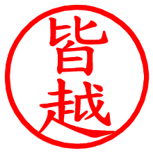 [朱肉の色]を選び、入力窓に“皆越”と入力して[生成]ボタンを押すと、印影が更新され、リンクから電子印鑑(デジタル印影)がダウンロードできます。 電子印鑑「皆越」の作り方文字表示が変なときや、文字バランスが悪いときは[字形切替]のチェックボックスでON/OFFを切り替え[生成]しなおしてください。 生成される画像は通常の印影「皆越.png」と、にじみを表現した少し太めの印影「皆越B.png」の背面透過PNG形式2種と、鮮明なPDF形式の印影「皆越.pdf」の計3種類です。 朱肉の微妙な色の違いを7色で表現しました。デフォルト(左端)は、JISが定めた朱肉の色のマンセル値(7.5R 5/14)をRGB値(217,66,54)に変換したものになっています。 「電子透かし」にチェックを入れて[生成]ボタンを押すと、タイムスタンプを電子透かしとして埋め込んだセキュアな電子印鑑が作れます。詳細は別ページの「タイムスタンプと電子透かし」でご覧ください。 皆越さんの日付印が作れます。「日付スタンプメーカー」は、社内向けの書類に利用されることの多い日付印(データ印)が無料で作れるWebアプリケーションです。中段に日付が入り、上段と下段は、ともに8文字まで文字が入ります。 ![]() 古代文字で落款印が作れます。「落款スタンプメーカー」で作品を引き立たせる落款印が作れます。