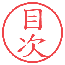 [朱肉の色]を選び、入力窓に“目次”と入力して[生成]ボタンを押すと、印影が更新され、リンクから電子印鑑(デジタル印影)がダウンロードできます。 電子印鑑「目次」の作り方文字表示が変なときや、文字バランスが悪いときは[字形切替]のチェックボックスでON/OFFを切り替え[生成]しなおしてください。 生成される画像は通常の印影「目次.png」と、にじみを表現した少し太めの印影「目次B.png」の背面透過PNG形式2種と、鮮明なPDF形式の印影「目次.pdf」の計3種類です。 朱肉の微妙な色の違いを7色で表現しました。デフォルト(左端)は、JISが定めた朱肉の色のマンセル値(7.5R 5/14)をRGB値(217,66,54)に変換したものになっています。 「電子透かし」にチェックを入れて[生成]ボタンを押すと、タイムスタンプを電子透かしとして埋め込んだセキュアな電子印鑑が作れます。詳細は別ページの「タイムスタンプと電子透かし」でご覧ください。 目次さんの日付印が作れます。「日付スタンプメーカー」は、社内向けの書類に利用されることの多い日付印(データ印)が無料で作れるWebアプリケーションです。中段に日付が入り、上段と下段は、ともに8文字まで文字が入ります。 ![]() 古代文字で落款印が作れます。「落款スタンプメーカー」で作品を引き立たせる落款印が作れます。