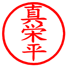 [朱肉の色]を選び、入力窓に“真栄平”と入力して[生成]ボタンを押すと、印影が更新され、リンクから電子印鑑(デジタル印影)がダウンロードできます。 電子印鑑「真栄平」の作り方文字表示が変なときや、文字バランスが悪いときは[字形切替]のチェックボックスでON/OFFを切り替え[生成]しなおしてください。 生成される画像は通常の印影「真栄平.png」と、にじみを表現した少し太めの印影「真栄平B.png」の背面透過PNG形式2種と、鮮明なPDF形式の印影「真栄平.pdf」の計3種類です。 朱肉の微妙な色の違いを7色で表現しました。デフォルト(左端)は、JISが定めた朱肉の色のマンセル値(7.5R 5/14)をRGB値(217,66,54)に変換したものになっています。 「電子透かし」にチェックを入れて[生成]ボタンを押すと、タイムスタンプを電子透かしとして埋め込んだセキュアな電子印鑑が作れます。詳細は別ページの「タイムスタンプと電子透かし」でご覧ください。 真栄平さんの日付印が作れます。「日付スタンプメーカー」は、社内向けの書類に利用されることの多い日付印(データ印)が無料で作れるWebアプリケーションです。中段に日付が入り、上段と下段は、ともに8文字まで文字が入ります。 ![]() 古代文字で落款印が作れます。「落款スタンプメーカー」で作品を引き立たせる落款印が作れます。