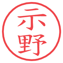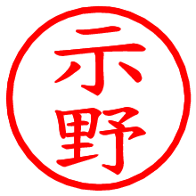[朱肉の色]を選び、入力窓に“示野”と入力して[生成]ボタンを押すと、印影が更新され、リンクから電子印鑑(デジタル印影)がダウンロードできます。 電子印鑑「示野」の作り方文字表示が変なときや、文字バランスが悪いときは[字形切替]のチェックボックスでON/OFFを切り替え[生成]しなおしてください。 生成される画像は通常の印影「示野.png」と、にじみを表現した少し太めの印影「示野B.png」の背面透過PNG形式2種と、鮮明なPDF形式の印影「示野.pdf」の計3種類です。 朱肉の微妙な色の違いを7色で表現しました。デフォルト(左端)は、JISが定めた朱肉の色のマンセル値(7.5R 5/14)をRGB値(217,66,54)に変換したものになっています。 「電子透かし」にチェックを入れて[生成]ボタンを押すと、タイムスタンプを電子透かしとして埋め込んだセキュアな電子印鑑が作れます。詳細は別ページの「タイムスタンプと電子透かし」でご覧ください。 示野さんの日付印が作れます。「日付スタンプメーカー」は、社内向けの書類に利用されることの多い日付印(データ印)が無料で作れるWebアプリケーションです。中段に日付が入り、上段と下段は、ともに8文字まで文字が入ります。 ![]() 古代文字で落款印が作れます。「落款スタンプメーカー」で作品を引き立たせる落款印が作れます。
