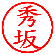 [朱肉の色]を選び、入力窓に“秀坂”と入力して[生成]ボタンを押すと、印影が更新され、リンクから電子印鑑(デジタル印影)がダウンロードできます。 電子印鑑「秀坂」の作り方文字表示が変なときや、文字バランスが悪いときは[字形切替]のチェックボックスでON/OFFを切り替え[生成]しなおしてください。 生成される画像は通常の印影「秀坂.png」と、にじみを表現した少し太めの印影「秀坂B.png」の背面透過PNG形式2種と、鮮明なPDF形式の印影「秀坂.pdf」の計3種類です。 朱肉の微妙な色の違いを7色で表現しました。デフォルト(左端)は、JISが定めた朱肉の色のマンセル値(7.5R 5/14)をRGB値(217,66,54)に変換したものになっています。 「電子透かし」にチェックを入れて[生成]ボタンを押すと、タイムスタンプを透かしとして埋め込んだセキュアな電子印鑑が作れます。詳細は別ページの「電子透かしとタイムスタンプ」でご覧ください。 秀坂さんの日付印が作れます。「日付スタンプメーカー」は、社内向けの書類に利用されることの多い日付印(データ印)が無料で作れるWebアプリケーションです。中段に日付が入り、上段と下段は、ともに8文字まで文字が入ります。 ![]() 古代文字で落款印が作れます。「落款スタンプメーカー」で作品を引き立たせる落款印が作れます。