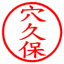 [朱肉の色]を選び、入力窓に“穴久保”と入力して[生成]ボタンを押すと、印影が更新され、リンクから電子印鑑(デジタル印影)がダウンロードできます。 電子印鑑「穴久保」の作り方文字表示が変なときや、文字バランスが悪いときは[字形切替]のチェックボックスでON/OFFを切り替え[生成]しなおしてください。 生成される画像は通常の印影「穴久保.png」と、にじみを表現した少し太めの印影「穴久保B.png」の背面透過PNG形式2種と、鮮明なPDF形式の印影「穴久保.pdf」の計3種類です。 朱肉の微妙な色の違いを7色で表現しました。デフォルト(左端)は、JISが定めた朱肉の色のマンセル値(7.5R 5/14)をRGB値(217,66,54)に変換したものになっています。 「電子透かし」にチェックを入れて[生成]ボタンを押すと、タイムスタンプを透かしとして埋め込んだセキュアな電子印鑑が作れます。詳細は別ページの「電子透かしとタイムスタンプ」でご覧ください。  穴久保さんの日付印が作れます。「日付スタンプメーカー」は、社内向けの書類に利用されることの多い日付印(データ印)が無料で作れるWebアプリケーションです。中段に日付が入り、上段と下段は、ともに8文字まで文字が入ります。 ![]()  古代文字で落款印が作れます。「落款スタンプメーカー」で作品を引き立たせる落款印が作れます。