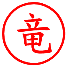 [朱肉の色]を選び、入力窓に“竜”と入力して[生成]ボタンを押すと、印影が更新され、リンクから電子印鑑(デジタル印影)がダウンロードできます。 電子印鑑「竜」の作り方文字表示が変なときや、文字バランスが悪いときは[字形切替]のチェックボックスでON/OFFを切り替え[生成]しなおしてください。 生成される画像は通常の印影「竜.png」と、にじみを表現した少し太めの印影「竜B.png」の背面透過PNG形式2種と、鮮明なPDF形式の印影「竜.pdf」の計3種類です。 朱肉の微妙な色の違いを7色で表現しました。デフォルト(左端)は、JISが定めた朱肉の色のマンセル値(7.5R 5/14)をRGB値(217,66,54)に変換したものになっています。 「電子透かし」にチェックを入れて[生成]ボタンを押すと、タイムスタンプを電子透かしとして埋め込んだセキュアな電子印鑑が作れます。詳細は別ページの「タイムスタンプと電子透かし」でご覧ください。 竜さんの日付印が作れます。「日付スタンプメーカー」は、社内向けの書類に利用されることの多い日付印(データ印)が無料で作れるWebアプリケーションです。中段に日付が入り、上段と下段は、ともに8文字まで文字が入ります。 ![]() 古代文字で落款印が作れます。「落款スタンプメーカー」で作品を引き立たせる落款印が作れます。
