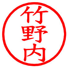 [朱肉の色]を選び、入力窓に“竹野内”と入力して[生成]ボタンを押すと、印影が更新され、リンクから電子印鑑(デジタル印影)がダウンロードできます。 電子印鑑「竹野内」の作り方文字表示が変なときや、文字バランスが悪いときは[字形切替]のチェックボックスでON/OFFを切り替え[生成]しなおしてください。 生成される画像は通常の印影「竹野内.png」と、にじみを表現した少し太めの印影「竹野内B.png」の背面透過PNG形式2種と、鮮明なPDF形式の印影「竹野内.pdf」の計3種類です。 朱肉の微妙な色の違いを7色で表現しました。デフォルト(左端)は、JISが定めた朱肉の色のマンセル値(7.5R 5/14)をRGB値(217,66,54)に変換したものになっています。 「電子透かし」にチェックを入れて[生成]ボタンを押すと、タイムスタンプを電子透かしとして埋め込んだセキュアな電子印鑑が作れます。詳細は別ページの「タイムスタンプと電子透かし」でご覧ください。 竹野内さんの日付印が作れます。「日付スタンプメーカー」は、社内向けの書類に利用されることの多い日付印(データ印)が無料で作れるWebアプリケーションです。中段に日付が入り、上段と下段は、ともに8文字まで文字が入ります。 ![]() 古代文字で落款印が作れます。「落款スタンプメーカー」で作品を引き立たせる落款印が作れます。