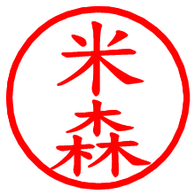 [朱肉の色]を選び、入力窓に“米森”と入力して[生成]ボタンを押すと、印影が更新され、リンクから電子印鑑(デジタル印影)がダウンロードできます。 電子印鑑「米森」の作り方文字表示が変なときや、文字バランスが悪いときは[字形切替]のチェックボックスでON/OFFを切り替え[生成]しなおしてください。 生成される画像は通常の印影「米森.png」と、にじみを表現した少し太めの印影「米森B.png」の背面透過PNG形式2種と、鮮明なPDF形式の印影「米森.pdf」の計3種類です。 朱肉の微妙な色の違いを7色で表現しました。デフォルト(左端)は、JISが定めた朱肉の色のマンセル値(7.5R 5/14)をRGB値(217,66,54)に変換したものになっています。 「電子透かし」にチェックを入れて[生成]ボタンを押すと、タイムスタンプを電子透かしとして埋め込んだセキュアな電子印鑑が作れます。詳細は別ページの「タイムスタンプと電子透かし」でご覧ください。 米森さんの日付印が作れます。「日付スタンプメーカー」は、社内向けの書類に利用されることの多い日付印(データ印)が無料で作れるWebアプリケーションです。中段に日付が入り、上段と下段は、ともに8文字まで文字が入ります。 ![]() 古代文字で落款印が作れます。「落款スタンプメーカー」で作品を引き立たせる落款印が作れます。
