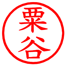 [朱肉の色]を選び、入力窓に“粟谷”と入力して[生成]ボタンを押すと、印影が更新され、リンクから電子印鑑(デジタル印影)がダウンロードできます。 電子印鑑「粟谷」の作り方文字表示が変なときや、文字バランスが悪いときは[字形切替]のチェックボックスでON/OFFを切り替え[生成]しなおしてください。 生成される画像は通常の印影「粟谷.png」と、にじみを表現した少し太めの印影「粟谷B.png」の背面透過PNG形式2種と、鮮明なPDF形式の印影「粟谷.pdf」の計3種類です。 朱肉の微妙な色の違いを7色で表現しました。デフォルト(左端)は、JISが定めた朱肉の色のマンセル値(7.5R 5/14)をRGB値(217,66,54)に変換したものになっています。 「電子透かし」にチェックを入れて[生成]ボタンを押すと、タイムスタンプを電子透かしとして埋め込んだセキュアな電子印鑑が作れます。詳細は別ページの「タイムスタンプと電子透かし」でご覧ください。 粟谷さんの日付印が作れます。「日付スタンプメーカー」は、社内向けの書類に利用されることの多い日付印(データ印)が無料で作れるWebアプリケーションです。中段に日付が入り、上段と下段は、ともに8文字まで文字が入ります。 ![]() 古代文字で落款印が作れます。「落款スタンプメーカー」で作品を引き立たせる落款印が作れます。