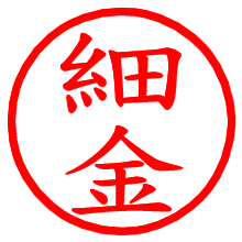 [朱肉の色]を選び、入力窓に“細金”と入力して[生成]ボタンを押すと、印影が更新され、リンクから電子印鑑(デジタル印影)がダウンロードできます。 電子印鑑「細金」の作り方文字表示が変なときや、文字バランスが悪いときは[字形切替]のチェックボックスでON/OFFを切り替え[生成]しなおしてください。 生成される画像は通常の印影「細金.png」と、にじみを表現した少し太めの印影「細金B.png」の背面透過PNG形式2種と、鮮明なPDF形式の印影「細金.pdf」の計3種類です。 朱肉の微妙な色の違いを7色で表現しました。デフォルト(左端)は、JISが定めた朱肉の色のマンセル値(7.5R 5/14)をRGB値(217,66,54)に変換したものになっています。 「電子透かし」にチェックを入れて[生成]ボタンを押すと、タイムスタンプを電子透かしとして埋め込んだセキュアな電子印鑑が作れます。詳細は別ページの「タイムスタンプと電子透かし」でご覧ください。 細金さんの日付印が作れます。「日付スタンプメーカー」は、社内向けの書類に利用されることの多い日付印(データ印)が無料で作れるWebアプリケーションです。中段に日付が入り、上段と下段は、ともに8文字まで文字が入ります。 ![]() 古代文字で落款印が作れます。「落款スタンプメーカー」で作品を引き立たせる落款印が作れます。