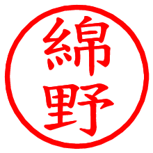 [朱肉の色]を選び、入力窓に“綿野”と入力して[生成]ボタンを押すと、印影が更新され、リンクから電子印鑑(デジタル印影)がダウンロードできます。 電子印鑑「綿野」の作り方文字表示が変なときや、文字バランスが悪いときは[字形切替]のチェックボックスでON/OFFを切り替え[生成]しなおしてください。 生成される画像は通常の印影「綿野.png」と、にじみを表現した少し太めの印影「綿野B.png」の背面透過PNG形式2種と、鮮明なPDF形式の印影「綿野.pdf」の計3種類です。 朱肉の微妙な色の違いを7色で表現しました。デフォルト(左端)は、JISが定めた朱肉の色のマンセル値(7.5R 5/14)をRGB値(217,66,54)に変換したものになっています。 「電子透かし」にチェックを入れて[生成]ボタンを押すと、タイムスタンプを電子透かしとして埋め込んだセキュアな電子印鑑が作れます。詳細は別ページの「タイムスタンプと電子透かし」でご覧ください。 綿野さんの日付印が作れます。「日付スタンプメーカー」は、社内向けの書類に利用されることの多い日付印(データ印)が無料で作れるWebアプリケーションです。中段に日付が入り、上段と下段は、ともに8文字まで文字が入ります。 ![]() 古代文字で落款印が作れます。「落款スタンプメーカー」で作品を引き立たせる落款印が作れます。