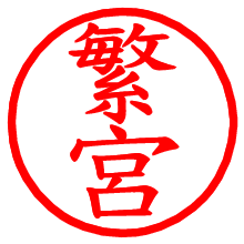 [朱肉の色]を選び、入力窓に“繁宮”と入力して[生成]ボタンを押すと、印影が更新され、リンクから電子印鑑(デジタル印影)がダウンロードできます。 電子印鑑「繁宮」の作り方文字表示が変なときや、文字バランスが悪いときは[字形切替]のチェックボックスでON/OFFを切り替え[生成]しなおしてください。 生成される画像は通常の印影「繁宮.png」と、にじみを表現した少し太めの印影「繁宮B.png」の背面透過PNG形式2種と、鮮明なPDF形式の印影「繁宮.pdf」の計3種類です。 朱肉の微妙な色の違いを7色で表現しました。デフォルト(左端)は、JISが定めた朱肉の色のマンセル値(7.5R 5/14)をRGB値(217,66,54)に変換したものになっています。 「電子透かし」にチェックを入れて[生成]ボタンを押すと、タイムスタンプを電子透かしとして埋め込んだセキュアな電子印鑑が作れます。詳細は別ページの「タイムスタンプと電子透かし」でご覧ください。 繁宮さんの日付印が作れます。「日付スタンプメーカー」は、社内向けの書類に利用されることの多い日付印(データ印)が無料で作れるWebアプリケーションです。中段に日付が入り、上段と下段は、ともに8文字まで文字が入ります。 ![]() 古代文字で落款印が作れます。「落款スタンプメーカー」で作品を引き立たせる落款印が作れます。