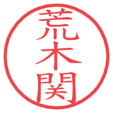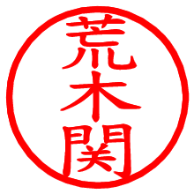[朱肉の色]を選び、入力窓に“荒木関”と入力して[生成]ボタンを押すと、印影が更新され、リンクから電子印鑑(デジタル印影)がダウンロードできます。 電子印鑑「荒木関」の作り方文字表示が変なときや、文字バランスが悪いときは[字形切替]のチェックボックスでON/OFFを切り替え[生成]しなおしてください。 生成される画像は通常の印影「荒木関.png」と、にじみを表現した少し太めの印影「荒木関B.png」の背面透過PNG形式2種と、鮮明なPDF形式の印影「荒木関.pdf」の計3種類です。 朱肉の微妙な色の違いを7色で表現しました。デフォルト(左端)は、JISが定めた朱肉の色のマンセル値(7.5R 5/14)をRGB値(217,66,54)に変換したものになっています。 「電子透かし」にチェックを入れて[生成]ボタンを押すと、タイムスタンプを電子透かしとして埋め込んだセキュアな電子印鑑が作れます。詳細は別ページの「タイムスタンプと電子透かし」でご覧ください。 荒木関さんの日付印が作れます。「日付スタンプメーカー」は、社内向けの書類に利用されることの多い日付印(データ印)が無料で作れるWebアプリケーションです。中段に日付が入り、上段と下段は、ともに8文字まで文字が入ります。 ![]() 古代文字で落款印が作れます。「落款スタンプメーカー」で作品を引き立たせる落款印が作れます。