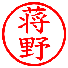 [朱肉の色]を選び、入力窓に“蒋野”と入力して[生成]ボタンを押すと、印影が更新され、リンクから電子印鑑(デジタル印影)がダウンロードできます。 電子印鑑「蒋野」の作り方文字表示が変なときや、文字バランスが悪いときは[字形切替]のチェックボックスでON/OFFを切り替え[生成]しなおしてください。 生成される画像は通常の印影「蒋野.png」と、にじみを表現した少し太めの印影「蒋野B.png」の背面透過PNG形式2種と、鮮明なPDF形式の印影「蒋野.pdf」の計3種類です。 朱肉の微妙な色の違いを7色で表現しました。デフォルト(左端)は、JISが定めた朱肉の色のマンセル値(7.5R 5/14)をRGB値(217,66,54)に変換したものになっています。 「電子透かし」にチェックを入れて[生成]ボタンを押すと、タイムスタンプを電子透かしとして埋め込んだセキュアな電子印鑑が作れます。詳細は別ページの「タイムスタンプと電子透かし」でご覧ください。 蒋野さんの日付印が作れます。「日付スタンプメーカー」は、社内向けの書類に利用されることの多い日付印(データ印)が無料で作れるWebアプリケーションです。中段に日付が入り、上段と下段は、ともに8文字まで文字が入ります。 ![]() 古代文字で落款印が作れます。「落款スタンプメーカー」で作品を引き立たせる落款印が作れます。