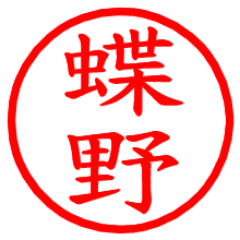 [朱肉の色]を選び、入力窓に“蝶野”と入力して[生成]ボタンを押すと、印影が更新され、リンクから電子印鑑(デジタル印影)がダウンロードできます。 電子印鑑「蝶野」の作り方文字表示が変なときや、文字バランスが悪いときは[字形切替]のチェックボックスでON/OFFを切り替え[生成]しなおしてください。 生成される画像は通常の印影「蝶野.png」と、にじみを表現した少し太めの印影「蝶野B.png」の背面透過PNG形式2種と、鮮明なPDF形式の印影「蝶野.pdf」の計3種類です。 朱肉の微妙な色の違いを7色で表現しました。デフォルト(左端)は、JISが定めた朱肉の色のマンセル値(7.5R 5/14)をRGB値(217,66,54)に変換したものになっています。 「電子透かし」にチェックを入れて[生成]ボタンを押すと、タイムスタンプを電子透かしとして埋め込んだセキュアな電子印鑑が作れます。詳細は別ページの「タイムスタンプと電子透かし」でご覧ください。 蝶野さんの日付印が作れます。「日付スタンプメーカー」は、社内向けの書類に利用されることの多い日付印(データ印)が無料で作れるWebアプリケーションです。中段に日付が入り、上段と下段は、ともに8文字まで文字が入ります。 ![]() 古代文字で落款印が作れます。「落款スタンプメーカー」で作品を引き立たせる落款印が作れます。