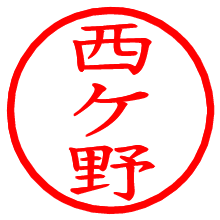 [朱肉の色]を選び、入力窓に“西ケ野”と入力して[生成]ボタンを押すと、印影が更新され、リンクから電子印鑑(デジタル印影)がダウンロードできます。 電子印鑑「西ケ野」の作り方文字表示が変なときや、文字バランスが悪いときは[字形切替]のチェックボックスでON/OFFを切り替え[生成]しなおしてください。 生成される画像は通常の印影「西ケ野.png」と、にじみを表現した少し太めの印影「西ケ野B.png」の背面透過PNG形式2種と、鮮明なPDF形式の印影「西ケ野.pdf」の計3種類です。 朱肉の微妙な色の違いを7色で表現しました。デフォルト(左端)は、JISが定めた朱肉の色のマンセル値(7.5R 5/14)をRGB値(217,66,54)に変換したものになっています。 「電子透かし」にチェックを入れて[生成]ボタンを押すと、タイムスタンプを電子透かしとして埋め込んだセキュアな電子印鑑が作れます。詳細は別ページの「タイムスタンプと電子透かし」でご覧ください。 西ケ野さんの日付印が作れます。「日付スタンプメーカー」は、社内向けの書類に利用されることの多い日付印(データ印)が無料で作れるWebアプリケーションです。中段に日付が入り、上段と下段は、ともに8文字まで文字が入ります。 ![]() 古代文字で落款印が作れます。「落款スタンプメーカー」で作品を引き立たせる落款印が作れます。