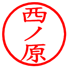 [朱肉の色]を選び、入力窓に“西ノ原”と入力して[生成]ボタンを押すと、印影が更新され、リンクから電子印鑑(デジタル印影)がダウンロードできます。 電子印鑑「西ノ原」の作り方文字表示が変なときや、文字バランスが悪いときは[字形切替]のチェックボックスでON/OFFを切り替え[生成]しなおしてください。 生成される画像は通常の印影「西ノ原.png」と、にじみを表現した少し太めの印影「西ノ原B.png」の背面透過PNG形式2種と、鮮明なPDF形式の印影「西ノ原.pdf」の計3種類です。 朱肉の微妙な色の違いを7色で表現しました。デフォルト(左端)は、JISが定めた朱肉の色のマンセル値(7.5R 5/14)をRGB値(217,66,54)に変換したものになっています。 「電子透かし」にチェックを入れて[生成]ボタンを押すと、タイムスタンプを透かしとして埋め込んだセキュアな電子印鑑が作れます。詳細は別ページの「電子透かしとタイムスタンプ」でご覧ください。 西ノ原さんの日付印が作れます。「日付スタンプメーカー」は、社内向けの書類に利用されることの多い日付印(データ印)が無料で作れるWebアプリケーションです。中段に日付が入り、上段と下段は、ともに8文字まで文字が入ります。 ![]() 古代文字で落款印が作れます。「落款スタンプメーカー」で作品を引き立たせる落款印が作れます。