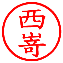 [朱肉の色]を選び、入力窓に“西嵜”と入力して[生成]ボタンを押すと、印影が更新され、リンクから電子印鑑(デジタル印影)がダウンロードできます。 電子印鑑「西嵜」の作り方文字表示が変なときや、文字バランスが悪いときは[字形切替]のチェックボックスでON/OFFを切り替え[生成]しなおしてください。 生成される画像は通常の印影「西嵜.png」と、にじみを表現した少し太めの印影「西嵜B.png」の背面透過PNG形式2種と、鮮明なPDF形式の印影「西嵜.pdf」の計3種類です。 朱肉の微妙な色の違いを7色で表現しました。デフォルト(左端)は、JISが定めた朱肉の色のマンセル値(7.5R 5/14)をRGB値(217,66,54)に変換したものになっています。 「電子透かし」にチェックを入れて[生成]ボタンを押すと、タイムスタンプを電子透かしとして埋め込んだセキュアな電子印鑑が作れます。詳細は別ページの「タイムスタンプと電子透かし」でご覧ください。 西嵜さんの日付印が作れます。「日付スタンプメーカー」は、社内向けの書類に利用されることの多い日付印(データ印)が無料で作れるWebアプリケーションです。中段に日付が入り、上段と下段は、ともに8文字まで文字が入ります。 ![]() 古代文字で落款印が作れます。「落款スタンプメーカー」で作品を引き立たせる落款印が作れます。