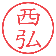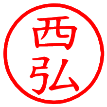 [朱肉の色]を選び、入力窓に“西弘”と入力して[生成]ボタンを押すと、印影が更新され、リンクから電子印鑑(デジタル印影)がダウンロードできます。 電子印鑑「西弘」の作り方文字表示が変なときや、文字バランスが悪いときは[字形切替]のチェックボックスでON/OFFを切り替え[生成]しなおしてください。 生成される画像は通常の印影「西弘.png」と、にじみを表現した少し太めの印影「西弘B.png」の背面透過PNG形式2種と、鮮明なPDF形式の印影「西弘.pdf」の計3種類です。 朱肉の微妙な色の違いを7色で表現しました。デフォルト(左端)は、JISが定めた朱肉の色のマンセル値(7.5R 5/14)をRGB値(217,66,54)に変換したものになっています。 「電子透かし」にチェックを入れて[生成]ボタンを押すと、タイムスタンプを電子透かしとして埋め込んだセキュアな電子印鑑が作れます。詳細は別ページの「タイムスタンプと電子透かし」でご覧ください。 西弘さんの日付印が作れます。「日付スタンプメーカー」は、社内向けの書類に利用されることの多い日付印(データ印)が無料で作れるWebアプリケーションです。中段に日付が入り、上段と下段は、ともに8文字まで文字が入ります。 ![]() 古代文字で落款印が作れます。「落款スタンプメーカー」で作品を引き立たせる落款印が作れます。