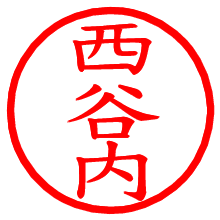[朱肉の色]を選び、入力窓に“西谷内”と入力して[生成]ボタンを押すと、印影が更新され、リンクから電子印鑑(デジタル印影)がダウンロードできます。 電子印鑑「西谷内」の作り方文字表示が変なときや、文字バランスが悪いときは[字形切替]のチェックボックスでON/OFFを切り替え[生成]しなおしてください。 生成される画像は通常の印影「西谷内.png」と、にじみを表現した少し太めの印影「西谷内B.png」の背面透過PNG形式2種と、鮮明なPDF形式の印影「西谷内.pdf」の計3種類です。 朱肉の微妙な色の違いを7色で表現しました。デフォルト(左端)は、JISが定めた朱肉の色のマンセル値(7.5R 5/14)をRGB値(217,66,54)に変換したものになっています。 「電子透かし」にチェックを入れて[生成]ボタンを押すと、タイムスタンプを電子透かしとして埋め込んだセキュアな電子印鑑が作れます。詳細は別ページの「タイムスタンプと電子透かし」でご覧ください。 西谷内さんの日付印が作れます。「日付スタンプメーカー」は、社内向けの書類に利用されることの多い日付印(データ印)が無料で作れるWebアプリケーションです。中段に日付が入り、上段と下段は、ともに8文字まで文字が入ります。 ![]() 古代文字で落款印が作れます。「落款スタンプメーカー」で作品を引き立たせる落款印が作れます。