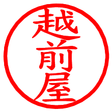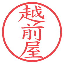 [朱肉の色]を選び、入力窓に“越前屋”と入力して[生成]ボタンを押すと、印影が更新され、リンクから電子印鑑(デジタル印影)がダウンロードできます。 電子印鑑「越前屋」の作り方文字表示が変なときや、文字バランスが悪いときは[字形切替]のチェックボックスでON/OFFを切り替え[生成]しなおしてください。 生成される画像は通常の印影「越前屋.png」と、にじみを表現した少し太めの印影「越前屋B.png」の背面透過PNG形式2種と、鮮明なPDF形式の印影「越前屋.pdf」の計3種類です。 朱肉の微妙な色の違いを7色で表現しました。デフォルト(左端)は、JISが定めた朱肉の色のマンセル値(7.5R 5/14)をRGB値(217,66,54)に変換したものになっています。 「電子透かし」にチェックを入れて[生成]ボタンを押すと、タイムスタンプを電子透かしとして埋め込んだセキュアな電子印鑑が作れます。詳細は別ページの「タイムスタンプと電子透かし」でご覧ください。 越前屋さんの日付印が作れます。「日付スタンプメーカー」は、社内向けの書類に利用されることの多い日付印(データ印)が無料で作れるWebアプリケーションです。中段に日付が入り、上段と下段は、ともに8文字まで文字が入ります。 ![]() 古代文字で落款印が作れます。「落款スタンプメーカー」で作品を引き立たせる落款印が作れます。