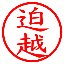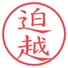 [朱肉の色]を選び、入力窓に“迫越”と入力して[生成]ボタンを押すと、印影が更新され、リンクから電子印鑑(デジタル印影)がダウンロードできます。 電子印鑑「迫越」の作り方文字表示が変なときや、文字バランスが悪いときは[字形切替]のチェックボックスでON/OFFを切り替え[生成]しなおしてください。 生成される画像は通常の印影「迫越.png」と、にじみを表現した少し太めの印影「迫越B.png」の背面透過PNG形式2種と、鮮明なPDF形式の印影「迫越.pdf」の計3種類です。 朱肉の微妙な色の違いを7色で表現しました。デフォルト(左端)は、JISが定めた朱肉の色のマンセル値(7.5R 5/14)をRGB値(217,66,54)に変換したものになっています。 「電子透かし」にチェックを入れて[生成]ボタンを押すと、タイムスタンプを透かしとして埋め込んだセキュアな電子印鑑が作れます。詳細は別ページの「電子透かしとタイムスタンプ」でご覧ください。  迫越さんの日付印が作れます。「日付スタンプメーカー」は、社内向けの書類に利用されることの多い日付印(データ印)が無料で作れるWebアプリケーションです。中段に日付が入り、上段と下段は、ともに8文字まで文字が入ります。 ![]()  古代文字で落款印が作れます。「落款スタンプメーカー」で作品を引き立たせる落款印が作れます。