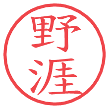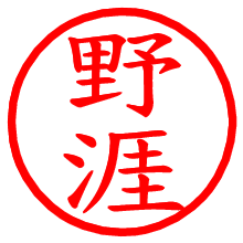 [朱肉の色]を選び、入力窓に“野涯”と入力して[生成]ボタンを押すと、印影が更新され、リンクから電子印鑑(デジタル印影)がダウンロードできます。 電子印鑑「野涯」の作り方文字表示が変なときや、文字バランスが悪いときは[字形切替]のチェックボックスでON/OFFを切り替え[生成]しなおしてください。 生成される画像は通常の印影「野涯.png」と、にじみを表現した少し太めの印影「野涯B.png」の背面透過PNG形式2種と、鮮明なPDF形式の印影「野涯.pdf」の計3種類です。 朱肉の微妙な色の違いを7色で表現しました。デフォルト(左端)は、JISが定めた朱肉の色のマンセル値(7.5R 5/14)をRGB値(217,66,54)に変換したものになっています。 「電子透かし」にチェックを入れて[生成]ボタンを押すと、タイムスタンプを電子透かしとして埋め込んだセキュアな電子印鑑が作れます。詳細は別ページの「タイムスタンプと電子透かし」でご覧ください。 野涯さんの日付印が作れます。「日付スタンプメーカー」は、社内向けの書類に利用されることの多い日付印(データ印)が無料で作れるWebアプリケーションです。中段に日付が入り、上段と下段は、ともに8文字まで文字が入ります。 ![]() 古代文字で落款印が作れます。「落款スタンプメーカー」で作品を引き立たせる落款印が作れます。