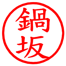 [朱肉の色]を選び、入力窓に“鍋坂”と入力して[生成]ボタンを押すと、印影が更新され、リンクから電子印鑑(デジタル印影)がダウンロードできます。 電子印鑑「鍋坂」の作り方文字表示が変なときや、文字バランスが悪いときは[字形切替]のチェックボックスでON/OFFを切り替え[生成]しなおしてください。 生成される画像は通常の印影「鍋坂.png」と、にじみを表現した少し太めの印影「鍋坂B.png」の背面透過PNG形式2種と、鮮明なPDF形式の印影「鍋坂.pdf」の計3種類です。 朱肉の微妙な色の違いを7色で表現しました。デフォルト(左端)は、JISが定めた朱肉の色のマンセル値(7.5R 5/14)をRGB値(217,66,54)に変換したものになっています。 「電子透かし」にチェックを入れて[生成]ボタンを押すと、タイムスタンプを透かしとして埋め込んだセキュアな電子印鑑が作れます。詳細は別ページの「電子透かしとタイムスタンプ」でご覧ください。 鍋坂さんの日付印が作れます。「日付スタンプメーカー」は、社内向けの書類に利用されることの多い日付印(データ印)が無料で作れるWebアプリケーションです。中段に日付が入り、上段と下段は、ともに8文字まで文字が入ります。 ![]() 古代文字で落款印が作れます。「落款スタンプメーカー」で作品を引き立たせる落款印が作れます。
