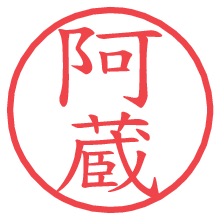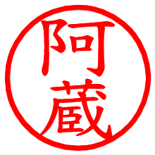 [朱肉の色]を選び、入力窓に“阿蔵”と入力して[生成]ボタンを押すと、印影が更新され、リンクから電子印鑑(デジタル印影)がダウンロードできます。 電子印鑑「阿蔵」の作り方文字表示が変なときや、文字バランスが悪いときは[字形切替]のチェックボックスでON/OFFを切り替え[生成]しなおしてください。 生成される画像は通常の印影「阿蔵.png」と、にじみを表現した少し太めの印影「阿蔵B.png」の背面透過PNG形式2種と、鮮明なPDF形式の印影「阿蔵.pdf」の計3種類です。 朱肉の微妙な色の違いを7色で表現しました。デフォルト(左端)は、JISが定めた朱肉の色のマンセル値(7.5R 5/14)をRGB値(217,66,54)に変換したものになっています。 「電子透かし」にチェックを入れて[生成]ボタンを押すと、タイムスタンプを電子透かしとして埋め込んだセキュアな電子印鑑が作れます。詳細は別ページの「タイムスタンプと電子透かし」でご覧ください。 阿蔵さんの日付印が作れます。「日付スタンプメーカー」は、社内向けの書類に利用されることの多い日付印(データ印)が無料で作れるWebアプリケーションです。中段に日付が入り、上段と下段は、ともに8文字まで文字が入ります。 ![]() 古代文字で落款印が作れます。「落款スタンプメーカー」で作品を引き立たせる落款印が作れます。
