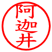 [朱肉の色]を選び、入力窓に“阿迦井”と入力して[生成]ボタンを押すと、印影が更新され、リンクから電子印鑑(デジタル印影)がダウンロードできます。 電子印鑑「阿迦井」の作り方文字表示が変なときや、文字バランスが悪いときは[字形切替]のチェックボックスでON/OFFを切り替え[生成]しなおしてください。 生成される画像は通常の印影「阿迦井.png」と、にじみを表現した少し太めの印影「阿迦井B.png」の背面透過PNG形式2種と、鮮明なPDF形式の印影「阿迦井.pdf」の計3種類です。 朱肉の微妙な色の違いを7色で表現しました。デフォルト(左端)は、JISが定めた朱肉の色のマンセル値(7.5R 5/14)をRGB値(217,66,54)に変換したものになっています。 「電子透かし」にチェックを入れて[生成]ボタンを押すと、タイムスタンプを電子透かしとして埋め込んだセキュアな電子印鑑が作れます。詳細は別ページの「タイムスタンプと電子透かし」でご覧ください。 阿迦井さんの日付印が作れます。「日付スタンプメーカー」は、社内向けの書類に利用されることの多い日付印(データ印)が無料で作れるWebアプリケーションです。中段に日付が入り、上段と下段は、ともに8文字まで文字が入ります。 ![]() 古代文字で落款印が作れます。「落款スタンプメーカー」で作品を引き立たせる落款印が作れます。