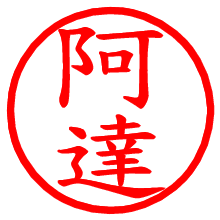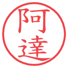 [朱肉の色]を選び、入力窓に“阿達”と入力して[生成]ボタンを押すと、印影が更新され、リンクから電子印鑑(デジタル印影)がダウンロードできます。 電子印鑑「阿達」の作り方文字表示が変なときや、文字バランスが悪いときは[字形切替]のチェックボックスでON/OFFを切り替え[生成]しなおしてください。 生成される画像は通常の印影「阿達.png」と、にじみを表現した少し太めの印影「阿達B.png」の背面透過PNG形式2種と、鮮明なPDF形式の印影「阿達.pdf」の計3種類です。 朱肉の微妙な色の違いを7色で表現しました。デフォルト(左端)は、JISが定めた朱肉の色のマンセル値(7.5R 5/14)をRGB値(217,66,54)に変換したものになっています。 「電子透かし」にチェックを入れて[生成]ボタンを押すと、タイムスタンプを電子透かしとして埋め込んだセキュアな電子印鑑が作れます。詳細は別ページの「タイムスタンプと電子透かし」でご覧ください。 阿達さんの日付印が作れます。「日付スタンプメーカー」は、社内向けの書類に利用されることの多い日付印(データ印)が無料で作れるWebアプリケーションです。中段に日付が入り、上段と下段は、ともに8文字まで文字が入ります。 ![]() 古代文字で落款印が作れます。「落款スタンプメーカー」で作品を引き立たせる落款印が作れます。