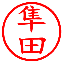 [朱肉の色]を選び、入力窓に“隼田”と入力して[生成]ボタンを押すと、印影が更新され、リンクから電子印鑑(デジタル印影)がダウンロードできます。 電子印鑑「隼田」の作り方文字表示が変なときや、文字バランスが悪いときは[字形切替]のチェックボックスでON/OFFを切り替え[生成]しなおしてください。 生成される画像は通常の印影「隼田.png」と、にじみを表現した少し太めの印影「隼田B.png」の背面透過PNG形式2種と、鮮明なPDF形式の印影「隼田.pdf」の計3種類です。 朱肉の微妙な色の違いを7色で表現しました。デフォルト(左端)は、JISが定めた朱肉の色のマンセル値(7.5R 5/14)をRGB値(217,66,54)に変換したものになっています。 「電子透かし」にチェックを入れて[生成]ボタンを押すと、タイムスタンプを電子透かしとして埋め込んだセキュアな電子印鑑が作れます。詳細は別ページの「タイムスタンプと電子透かし」でご覧ください。 隼田さんの日付印が作れます。「日付スタンプメーカー」は、社内向けの書類に利用されることの多い日付印(データ印)が無料で作れるWebアプリケーションです。中段に日付が入り、上段と下段は、ともに8文字まで文字が入ります。 ![]() 古代文字で落款印が作れます。「落款スタンプメーカー」で作品を引き立たせる落款印が作れます。
