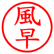 [朱肉の色]を選び、入力窓に“風早”と入力して[生成]ボタンを押すと、印影が更新され、リンクから電子印鑑(デジタル印影)がダウンロードできます。 電子印鑑「風早」の作り方文字表示が変なときや、文字バランスが悪いときは[字形切替]のチェックボックスでON/OFFを切り替え[生成]しなおしてください。 生成される画像は通常の印影「風早.png」と、にじみを表現した少し太めの印影「風早B.png」の背面透過PNG形式2種と、鮮明なPDF形式の印影「風早.pdf」の計3種類です。 朱肉の微妙な色の違いを7色で表現しました。デフォルト(左端)は、JISが定めた朱肉の色のマンセル値(7.5R 5/14)をRGB値(217,66,54)に変換したものになっています。 「電子透かし」にチェックを入れて[生成]ボタンを押すと、タイムスタンプを電子透かしとして埋め込んだセキュアな電子印鑑が作れます。詳細は別ページの「タイムスタンプと電子透かし」でご覧ください。 風早さんの日付印が作れます。「日付スタンプメーカー」は、社内向けの書類に利用されることの多い日付印(データ印)が無料で作れるWebアプリケーションです。中段に日付が入り、上段と下段は、ともに8文字まで文字が入ります。 ![]() 古代文字で落款印が作れます。「落款スタンプメーカー」で作品を引き立たせる落款印が作れます。
