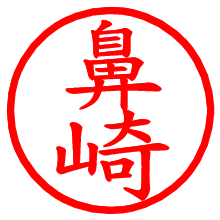 [朱肉の色]を選び、入力窓に“鼻崎”と入力して[生成]ボタンを押すと、印影が更新され、リンクから電子印鑑(デジタル印影)がダウンロードできます。 電子印鑑「鼻崎」の作り方文字表示が変なときや、文字バランスが悪いときは[字形切替]のチェックボックスでON/OFFを切り替え[生成]しなおしてください。 生成される画像は通常の印影「鼻崎.png」と、にじみを表現した少し太めの印影「鼻崎B.png」の背面透過PNG形式2種と、鮮明なPDF形式の印影「鼻崎.pdf」の計3種類です。 朱肉の微妙な色の違いを7色で表現しました。デフォルト(左端)は、JISが定めた朱肉の色のマンセル値(7.5R 5/14)をRGB値(217,66,54)に変換したものになっています。 「電子透かし」にチェックを入れて[生成]ボタンを押すと、タイムスタンプを電子透かしとして埋め込んだセキュアな電子印鑑が作れます。詳細は別ページの「タイムスタンプと電子透かし」でご覧ください。 鼻崎さんの日付印が作れます。「日付スタンプメーカー」は、社内向けの書類に利用されることの多い日付印(データ印)が無料で作れるWebアプリケーションです。中段に日付が入り、上段と下段は、ともに8文字まで文字が入ります。 ![]() 古代文字で落款印が作れます。「落款スタンプメーカー」で作品を引き立たせる落款印が作れます。